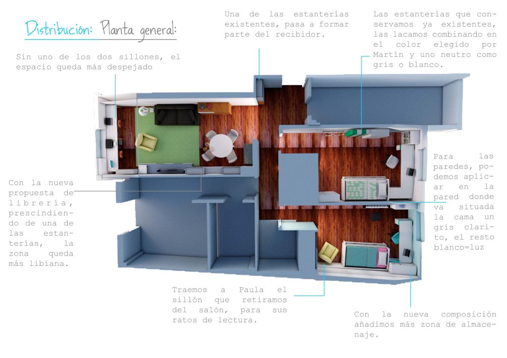 En la vivienda de ésta familia no puede faltar la lectura ni la música, con lo cual necesitan mucho almacenamiento para ello, el cual lo tenían, pero no sabían cómo redistribuirlo, para así poder hacer de lo que era el estudio una habitación para el niño y de lo que era la habitación compartida, que a partir de ahora fuese la habitación de la niña.