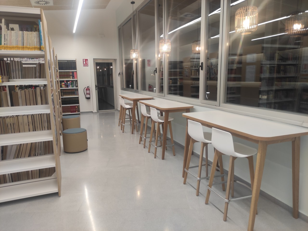 Entre los distintos espacios, el centro cuenta con una biblioteca de gran tamaño, que dispone de puestos de consulta y lectura en varias mesas altas en la zona del gran ventanal, para maximizar el tiempo de uso de luz natural. Compartiendo espacio, mediante el diseño a medida de una mampara en madera natural, se creó una zona de lectura y prensa. Seguido a ella se da acceso a la biblioteca infantil, con zona de cuentacuentos y estantes a la medida de los peques, para que tengan su propia autonomía a la hora de coger los libros. Por supuesto todo en colores muy divertidos! También podemos encontrar una sala de estudio, aula taller y aulas polivalentes, así como un auditorio con un gran patio de butacas.