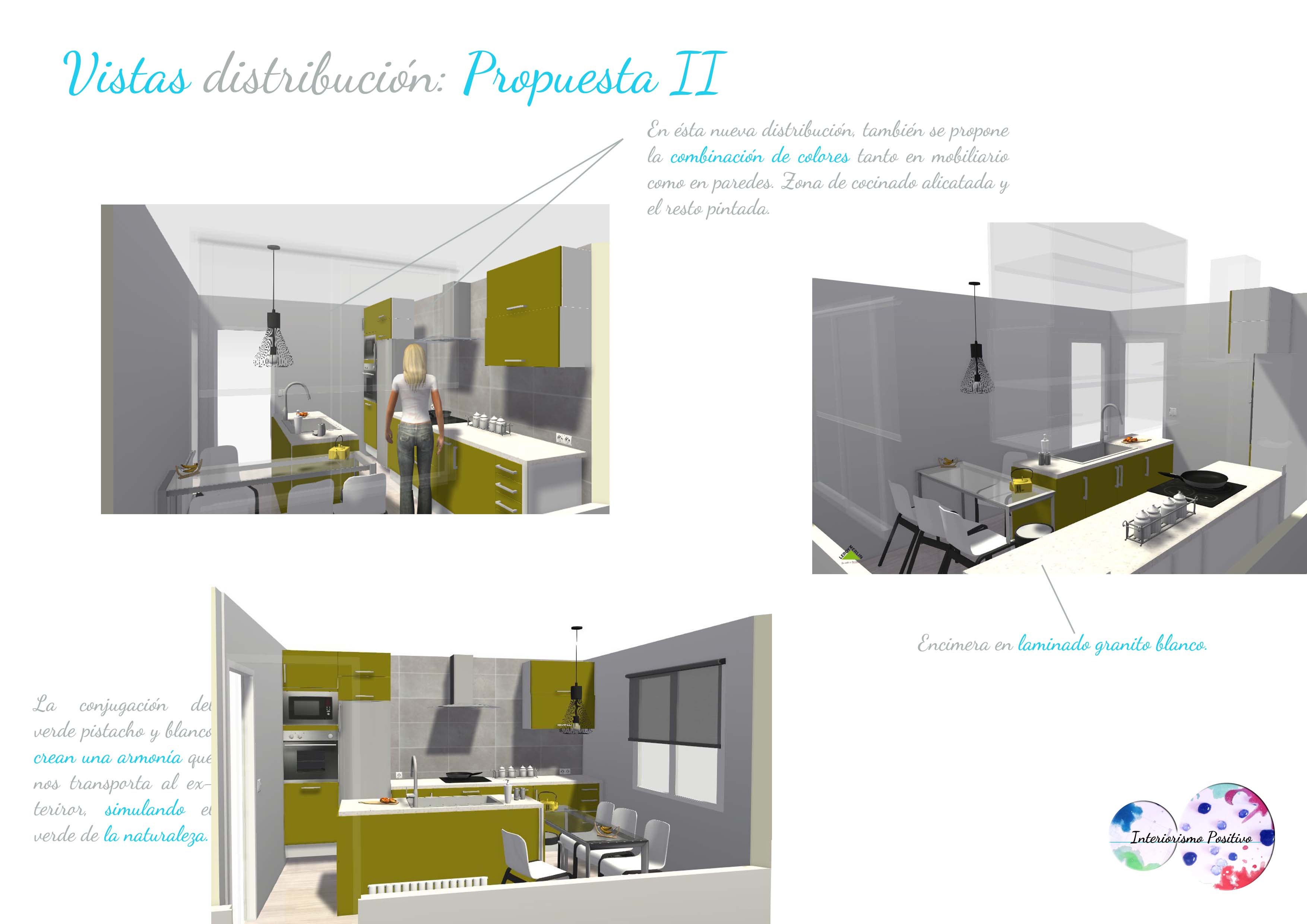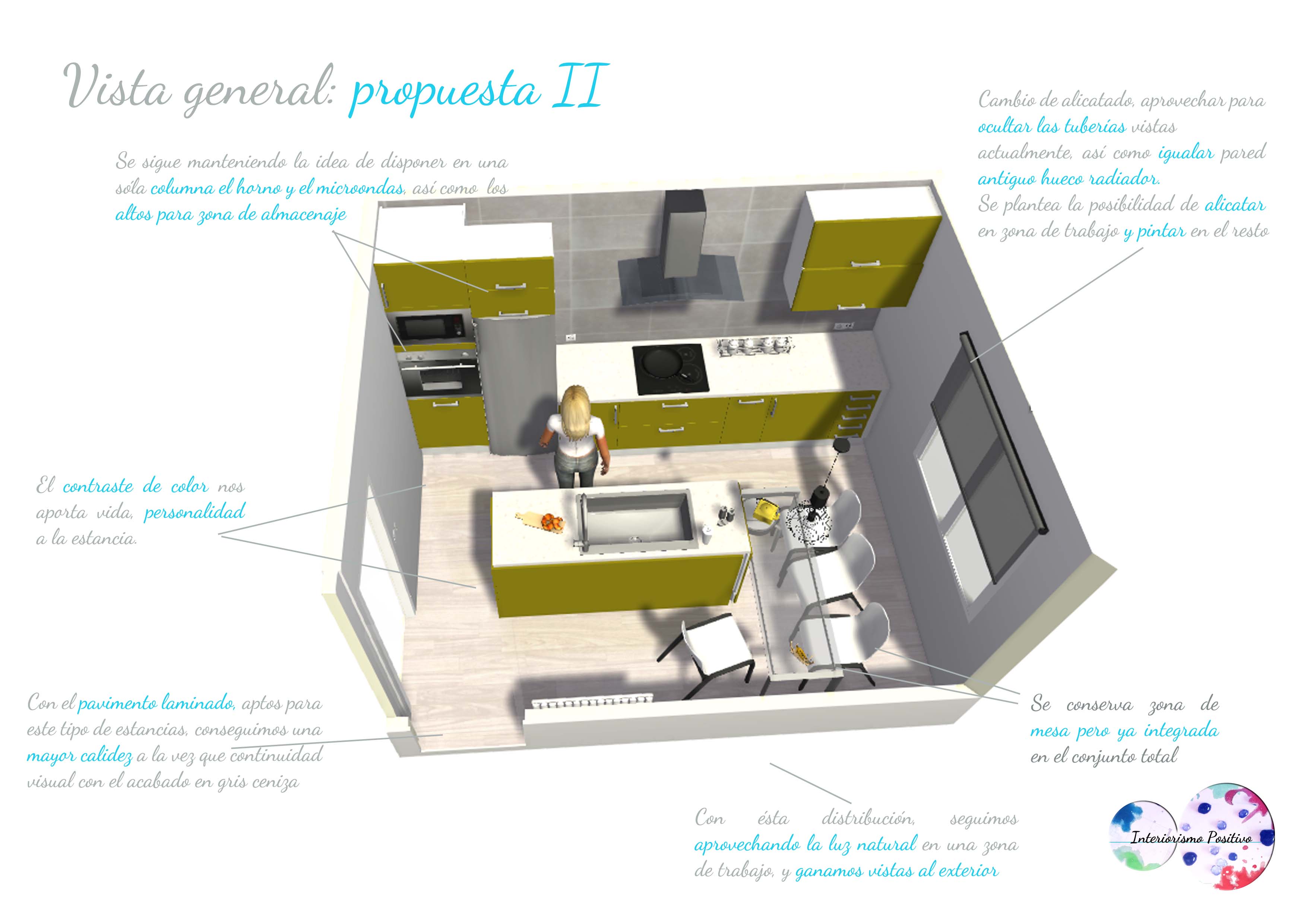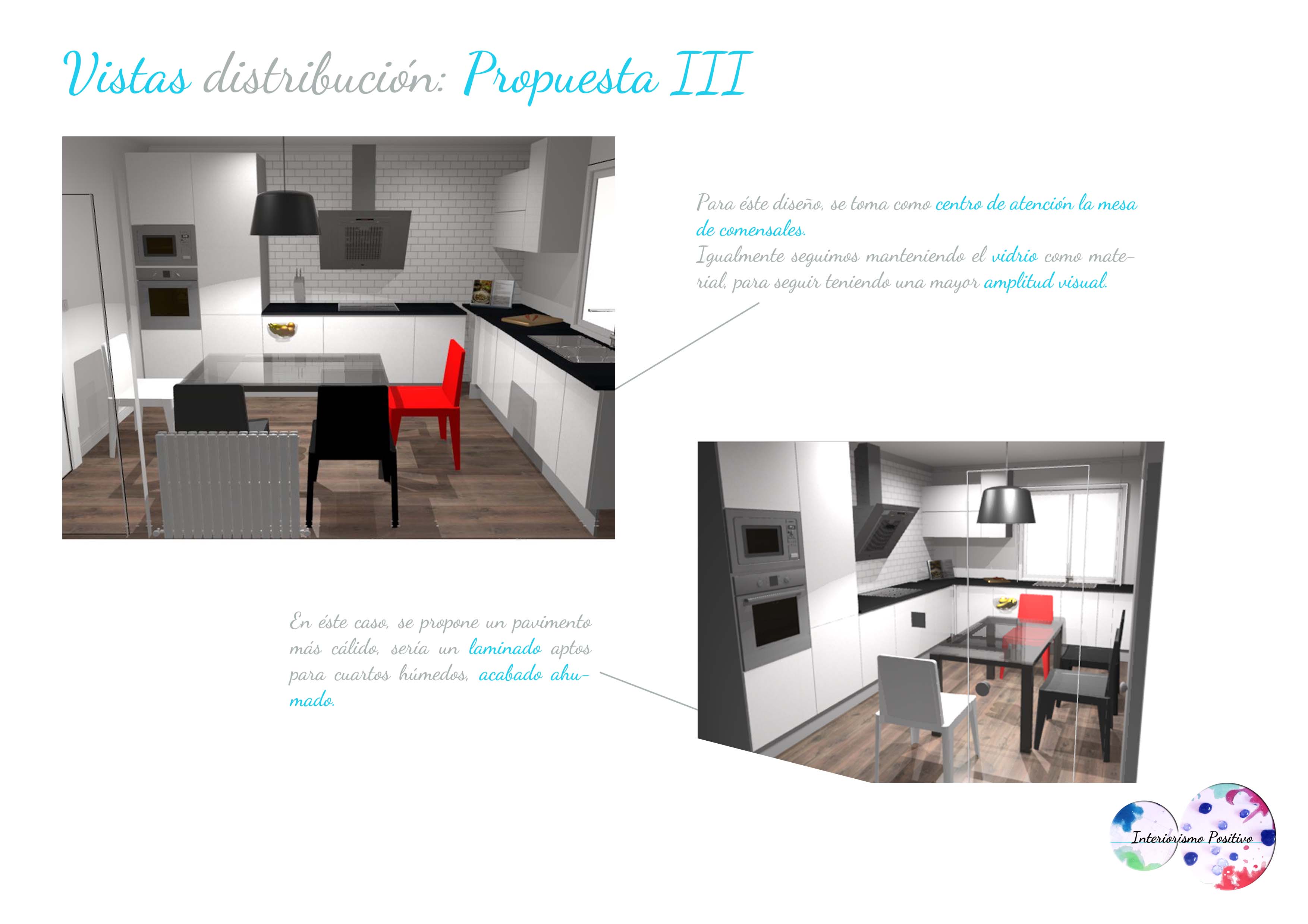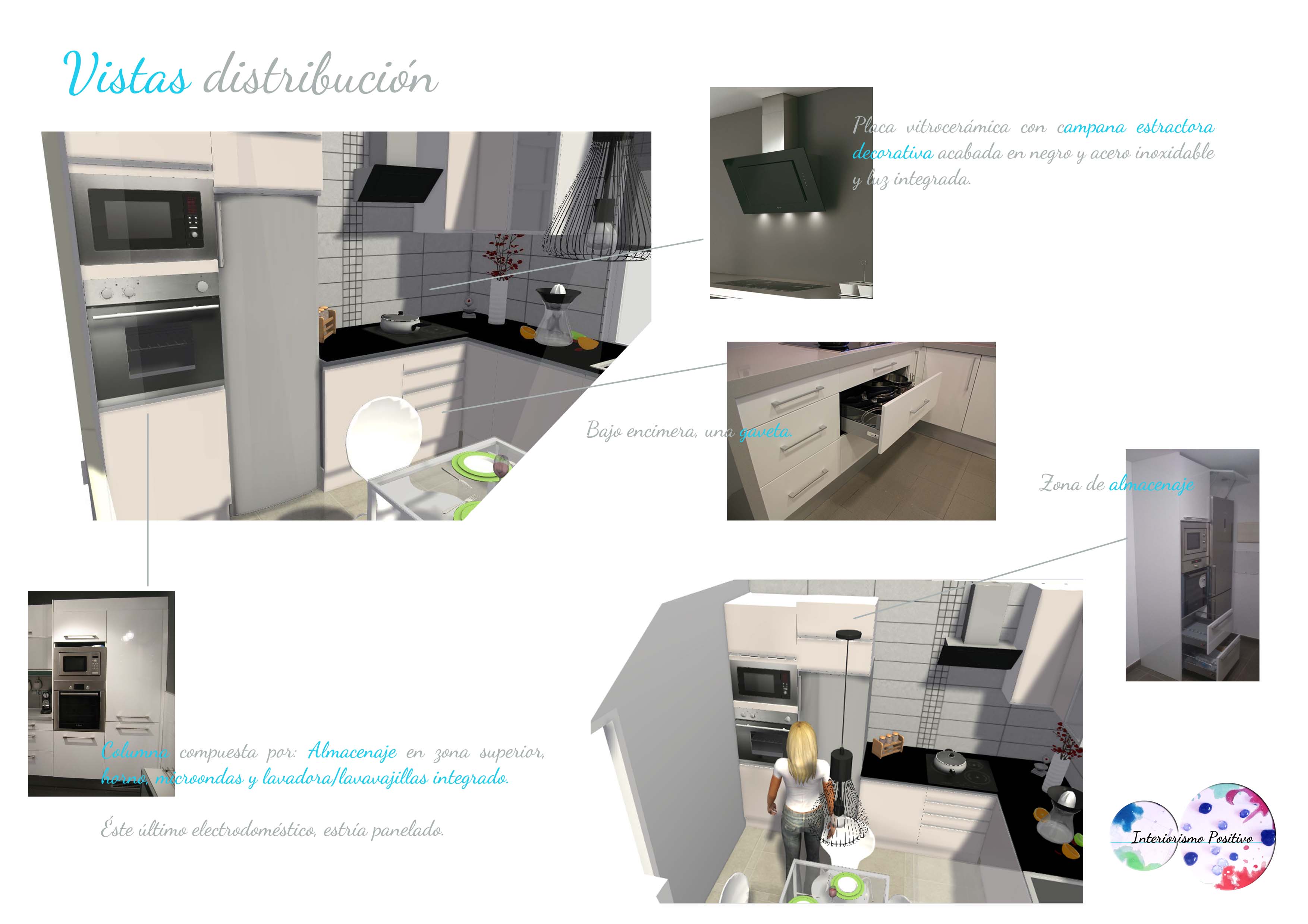Sandra, como solución decidió pedirnos ayuda y de momento esta ha sido la propuesta, una cocina más funcional, bien distribuida, generando más espacios de almacenamiento y de trabajo así como integrando en el conjunto total la zona de comensales.