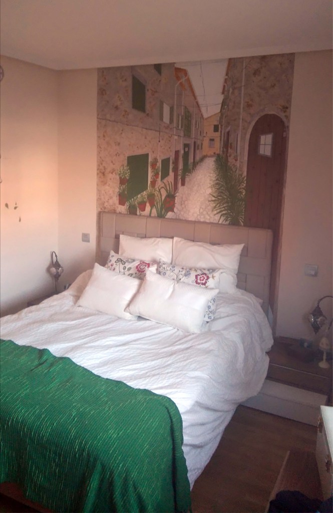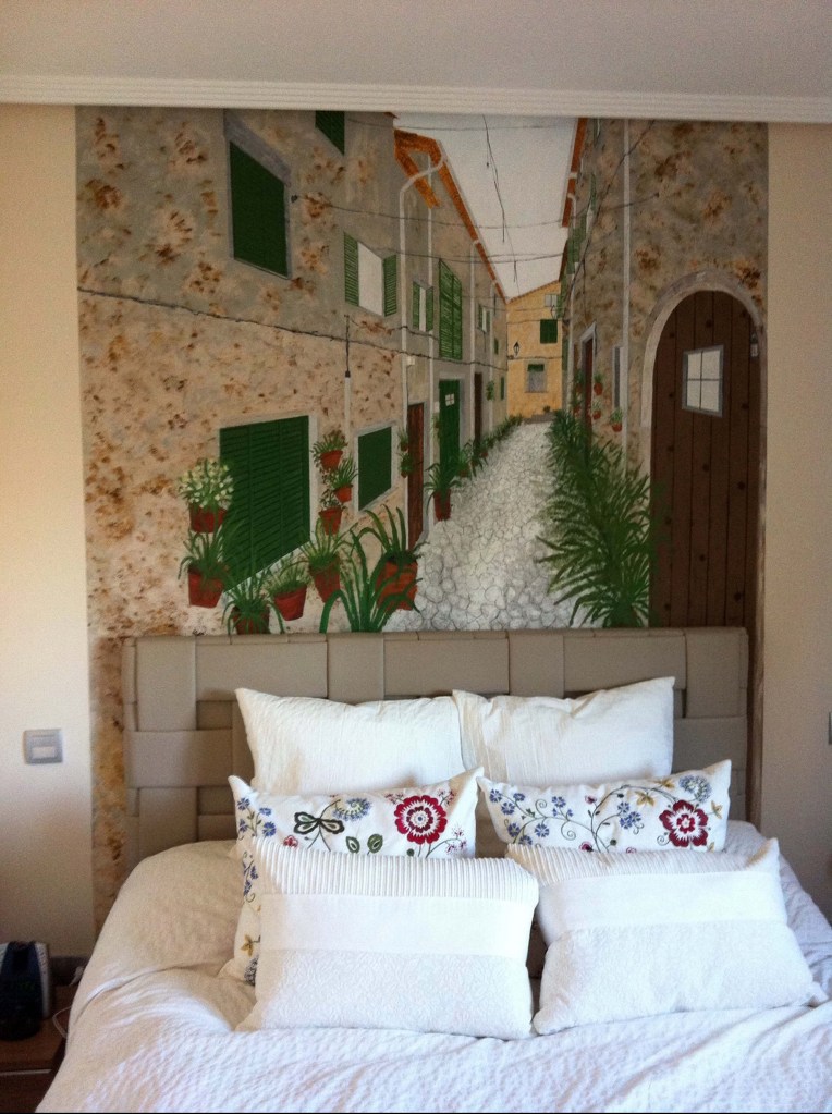 Las imágenes corresponden a una habitación principal, en esta ocasión se eligió por parte de los dueños un lugar que les trajera buenos recuerdos, una calle de Vallemosa (Mallorca). La tonalidad propia del lugar junto a la vegetación que le caracteriza aportan un toque de frescura y luz a todo el conjunto.