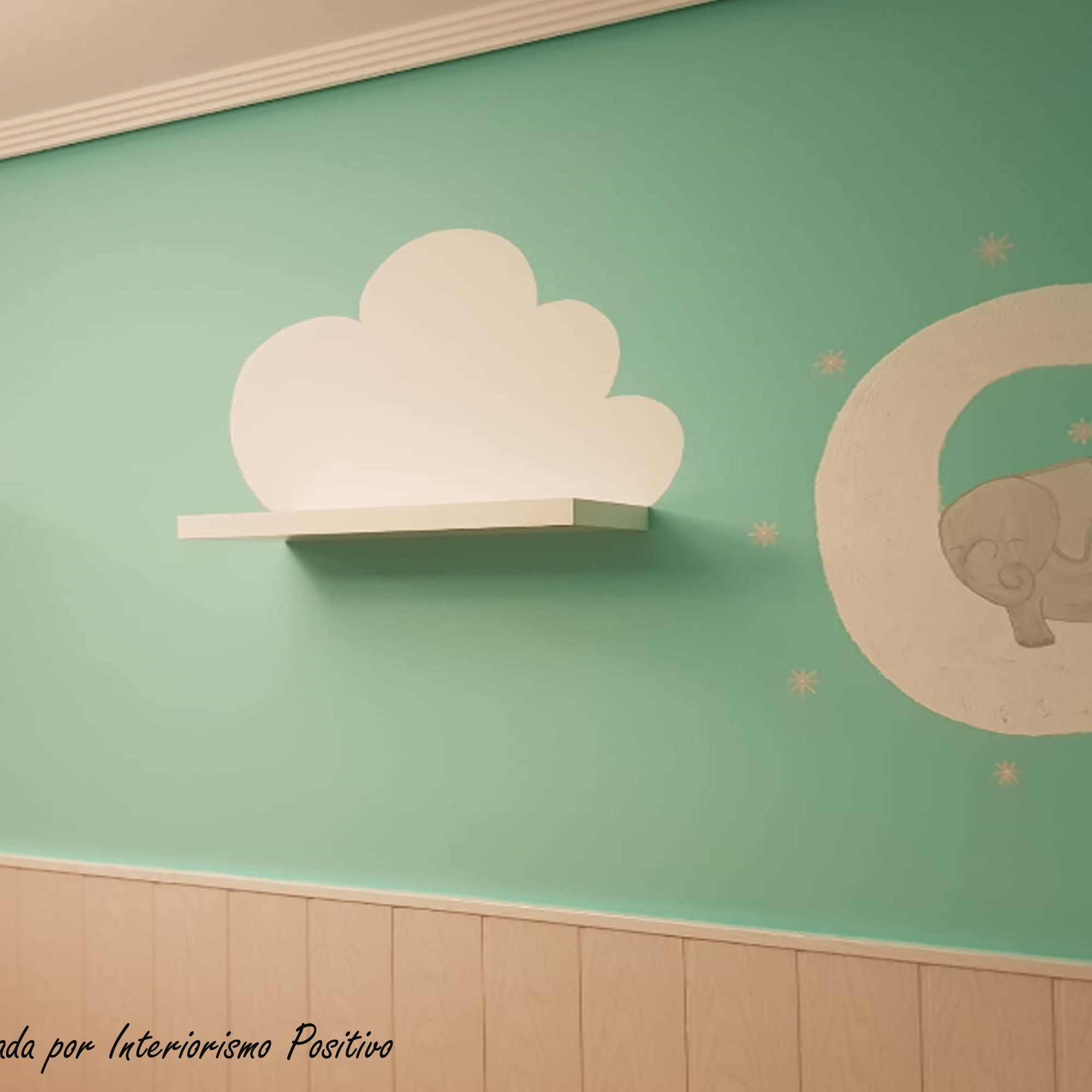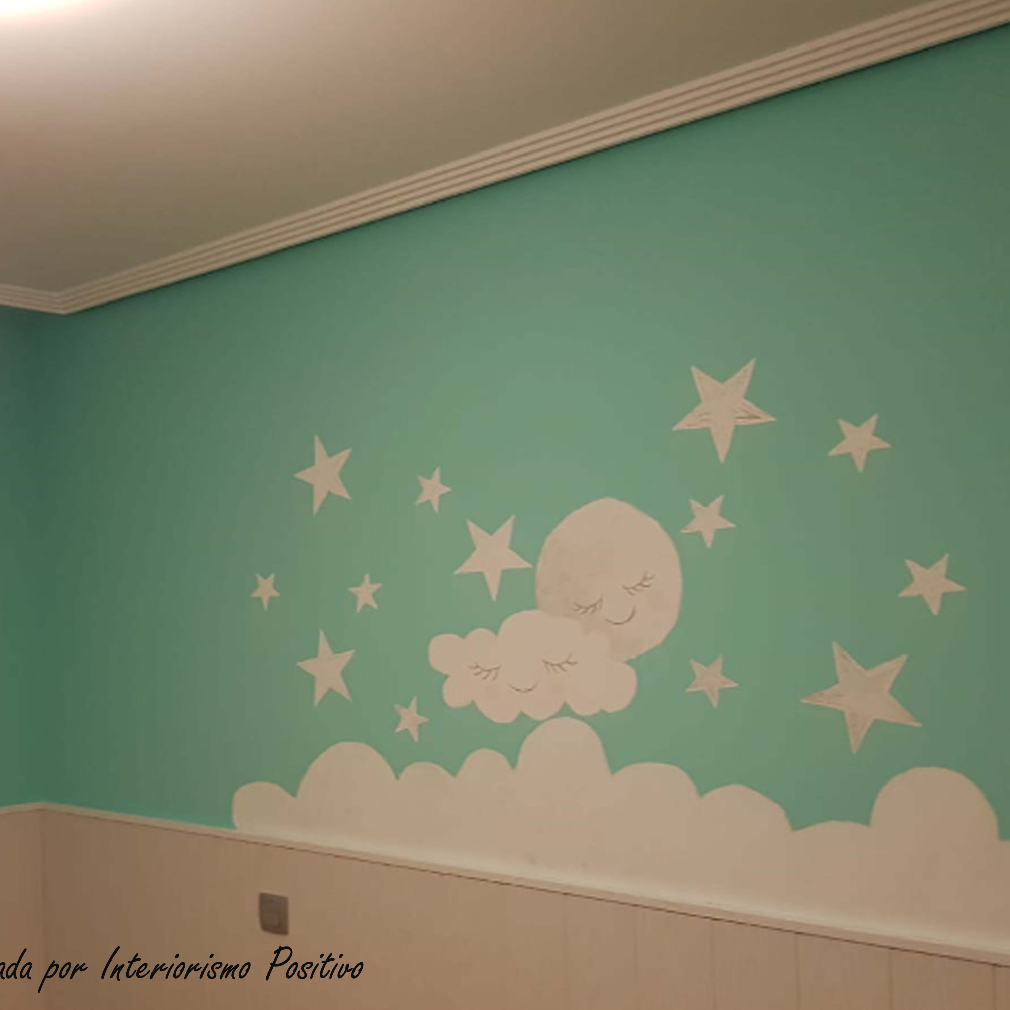 Para la habitación de Mateo, sus papás querían que tuviera una habitación diferente, especial, que le hiciera sentirse siempre como si estuviera entre algodones, por eso optamos por sorprenderles con un mural que inspirara «dulces sueños». Con el tono blanco se aporta tranquilidad a demás de potenciar la luz natural y con el verde aguamarina transmitimos serenidad y relajación.