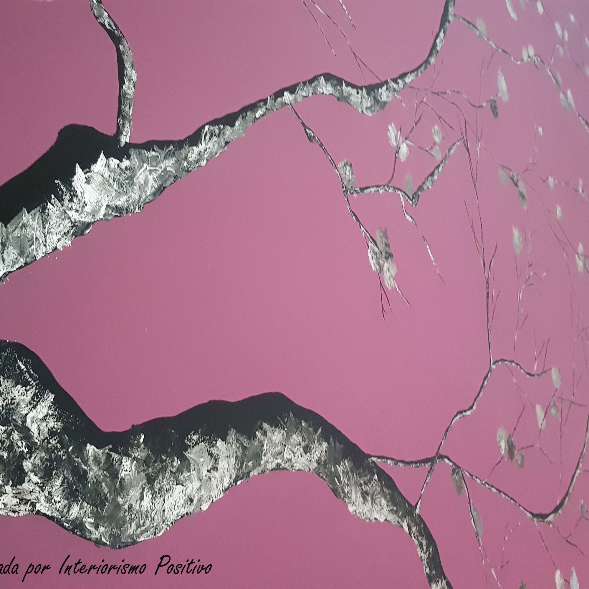Carolina quería dar un toque de personalidad a su habitación, con algo sencillo pero elegante y que mejor manera que con este mural inspirado en vegetación. Con los tonos plata sobre negro se consigue dar un aspecto 3D a la pintura mural, algo que a Carolina la encanto!. Los pajaritos reflejan el amor, representando a dos seres que se encuentran, viven felices y comen perdices!